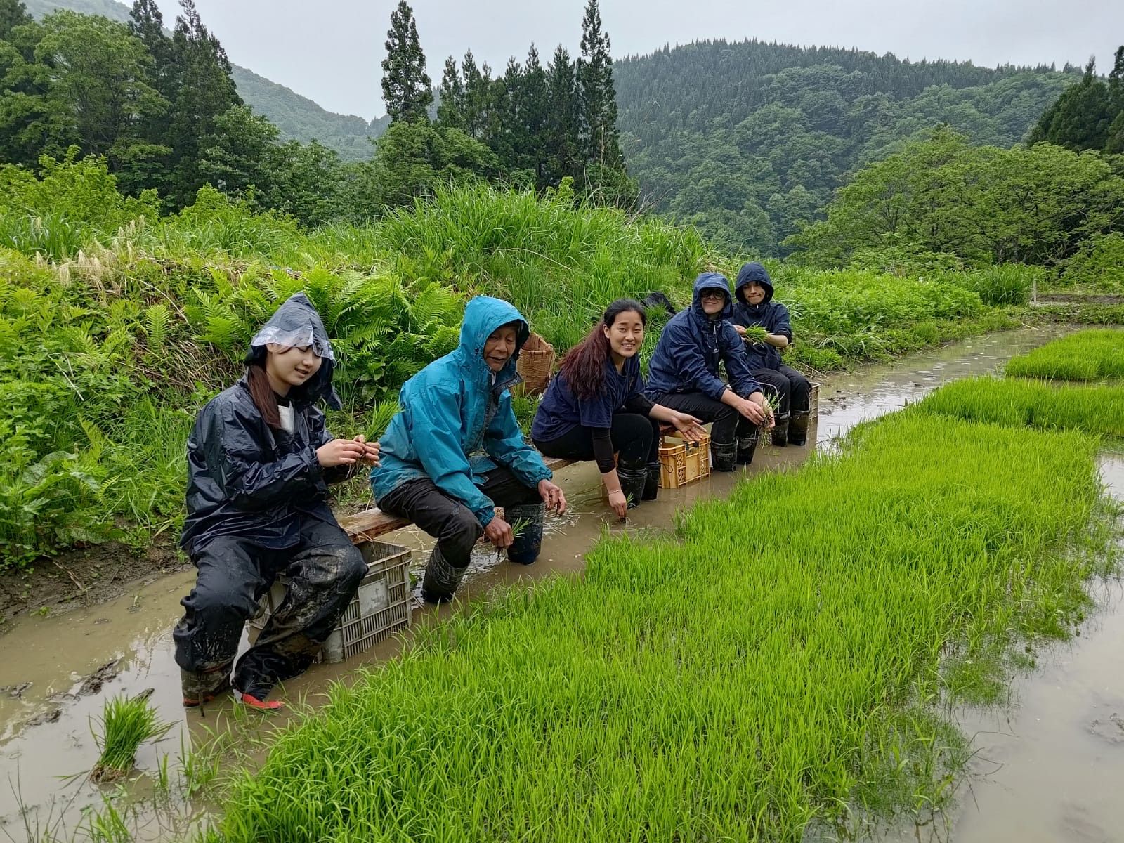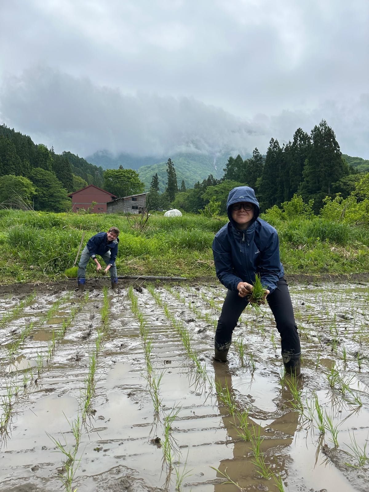 Rain on our first day planting rice seedlings.