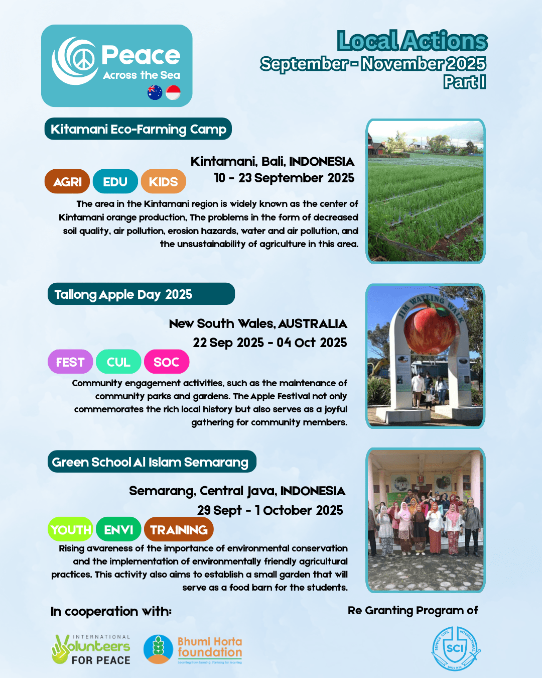 With funding from SCI’s Re-Granting Scheme, we hosted Peace Across the Sea, a weekly online training throughout July, bringing together 20 participants—10 from Australia and 10 from Indonesia. This collaborative programme is a joint initiative between International Volunteers for Peace Australia (IVP Australia) and the Bhumi Horta Foundation Indonesia (BHF).